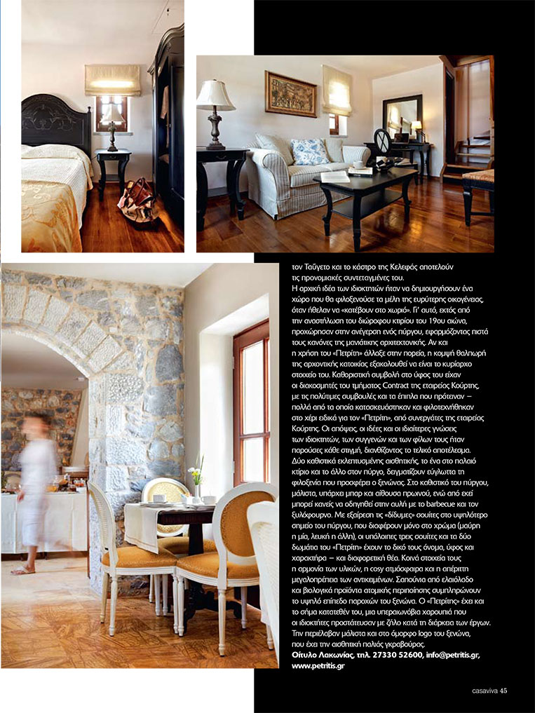 Δείτε την παρουσίαση του ξενώνα “Πετρίτης” στο Οίτυλο Λακωνίας στο περιοδικό Casaviva. Οι διακοσμητές της ομάδας Kourtis Contract επιμελήθηκαν την επίπλωση και τη διακόσμηση του ξενώνα.