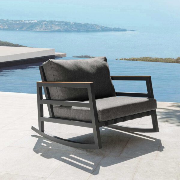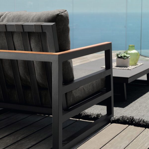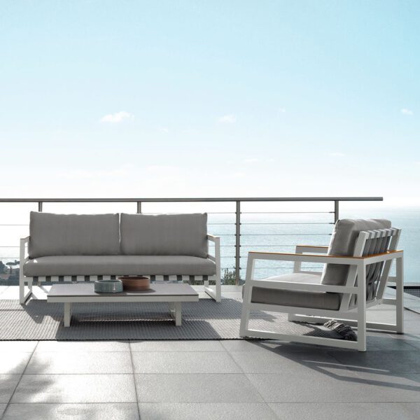 The sophisticated feature of the Italian design and the nobility of the artisan tradition characterize this Alabama Alu outdoor living armchair. Thanks to the comfortable seat and the discreet size, it is able to satisfy every need of space and style, having a perfect alchemy with the surrounding context. The structure is in powder-coated aluminium and a teak slat finishes the upper side of the armrests and of the backrest. Synthetic elastic straps specific for outdoor spaces support the seat and the backrest. The cushions are in removable fabric, easy to wash and weather resistant. Quick dry foam padding.
