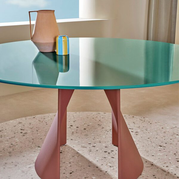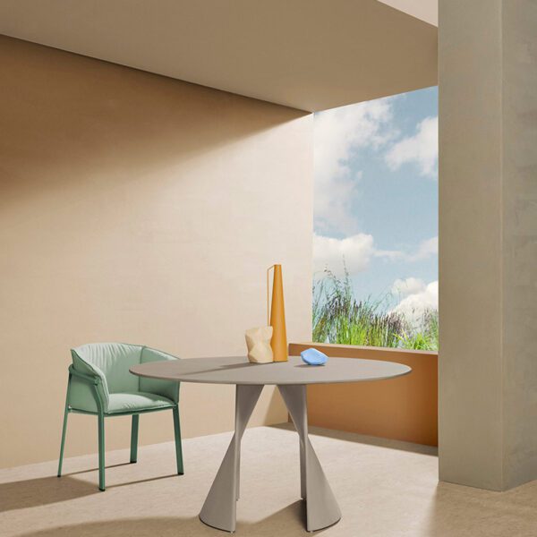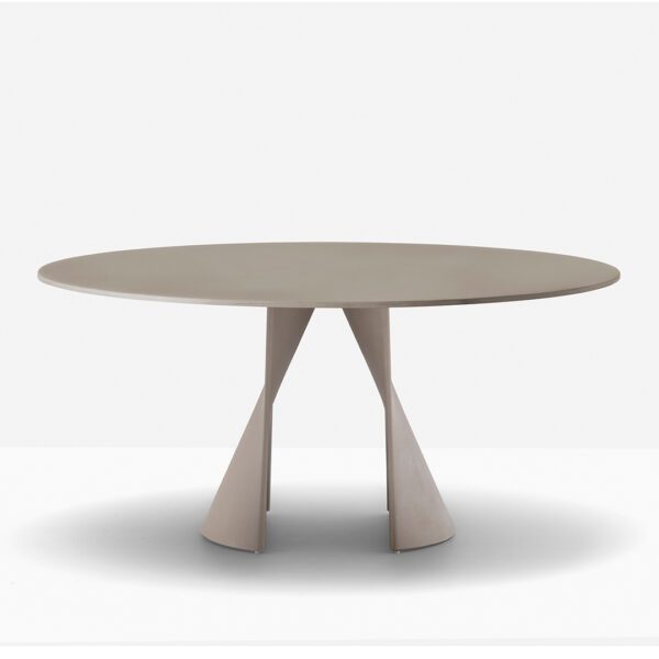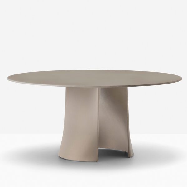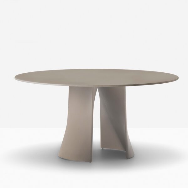 Anemos is an outdoor table characterised by simple yet architectural shapes. Its distinctive feature lies in the base, composed by two separate aluminium shells secured to the top, that take on a flexible and sinuous shape through a double curvature. The result is a visually light yet stable and solid table, capable of supporting large round tops.