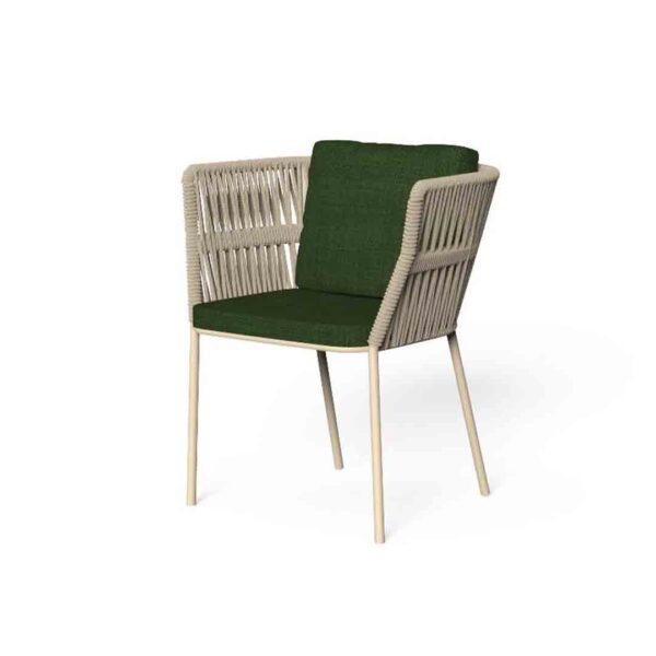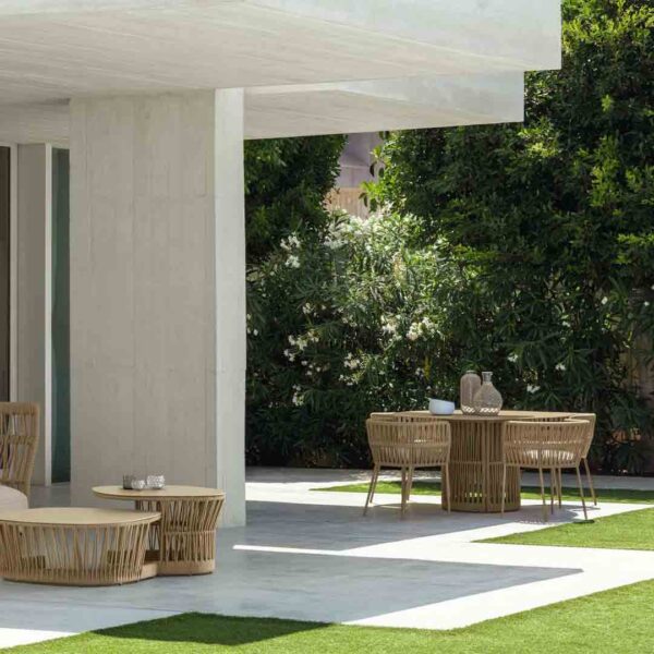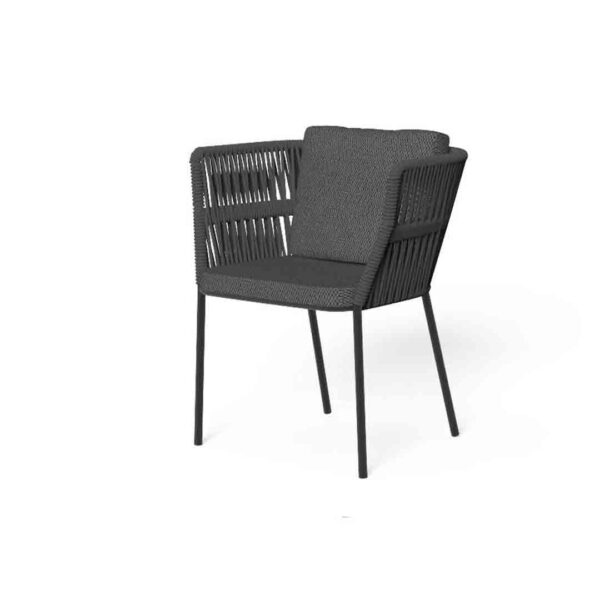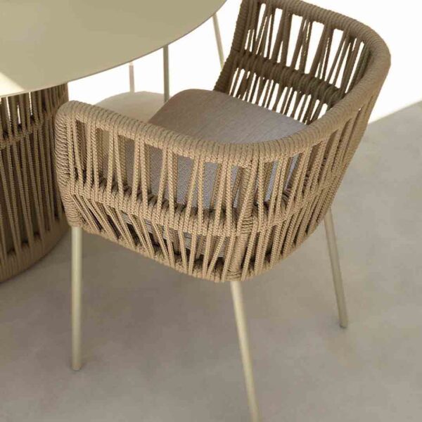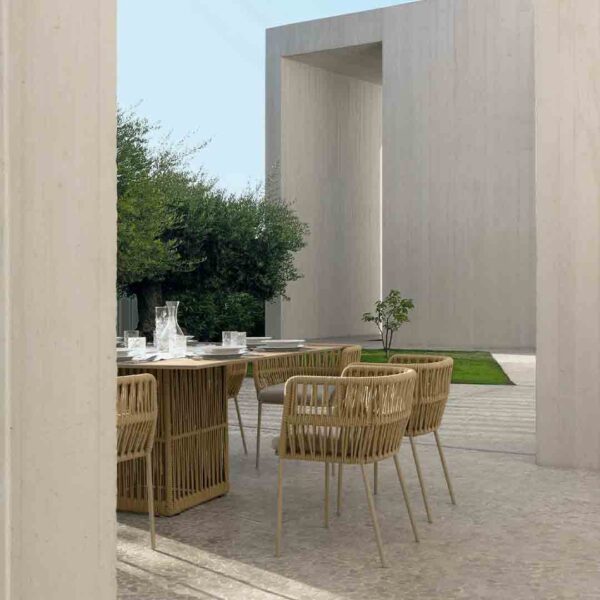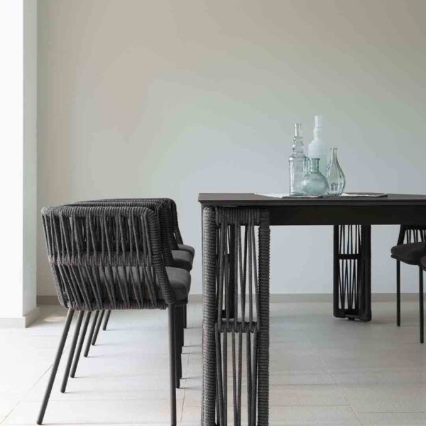 Bold and sculptural, the Cliff Dining Chair by Talenti is designed to stand out. Its tubular aluminium frame is wrapped in an intricate weave of wide, flat synthetic rope, creating a visually striking texture. The spacious seat and plush cushion offer ultimate comfort, while the materials are engineered for year-round outdoor performance.