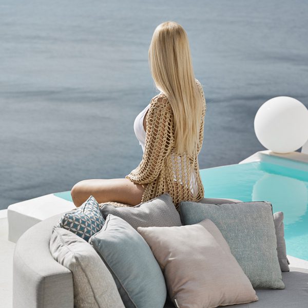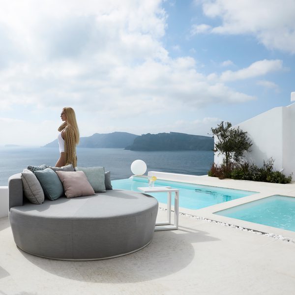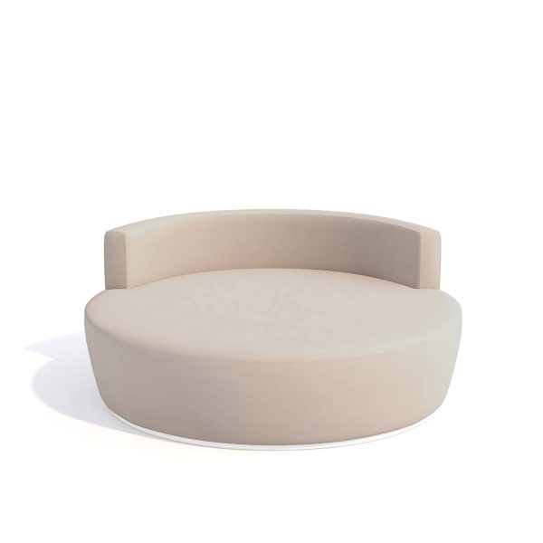 Η επιφάνειά της είναι επενδυμένη με ύφασμα εξωτερικού χώρου υψηλής αντοχής, που αντέχει στον ήλιο, την υγρασία και τη συχνή χρήση. Το αλουμινένιο πλαίσιο προσφέρει σταθερότητα και ανθεκτικότητα, ενώ το στρογγυλό της σχήμα δημιουργεί έναν φυσικό «κύκλο χαλάρωσης» για ένα ή δύο άτομα.