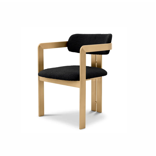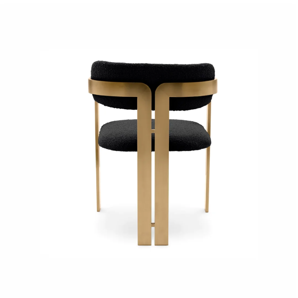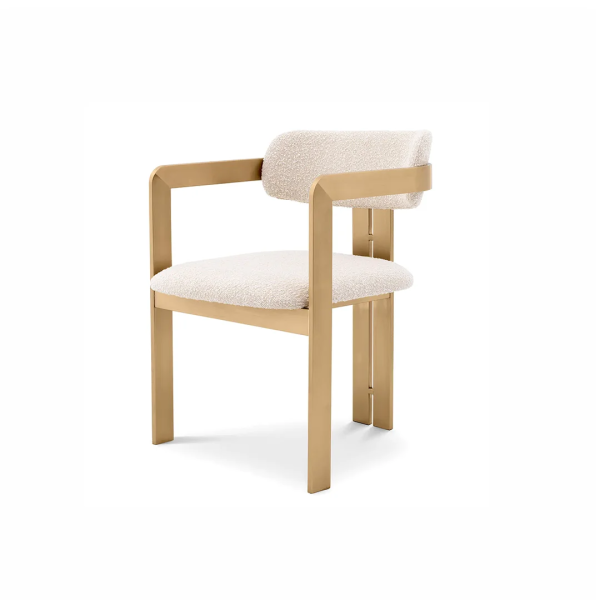 Σίγουρα θα τραβήξει τα βλέμματα των καλεσμένων σας, καθώς αυτή η στιλάτη καρέκλα με μοναδικό design διαθέτει δύο μπράτσα που ενσωματώνονται στα μπροστινά πόδια και δύο πίσω πόδια που στηρίζουν την στρογγυλεμένη πλάτη. Ο σκελετός διαθέτει φινίρισμα από βουρτσισμένο ορείχαλκο και είναι επενδεδυμένος με ύφασμα bouclé σε κρεμ απόχρωση.