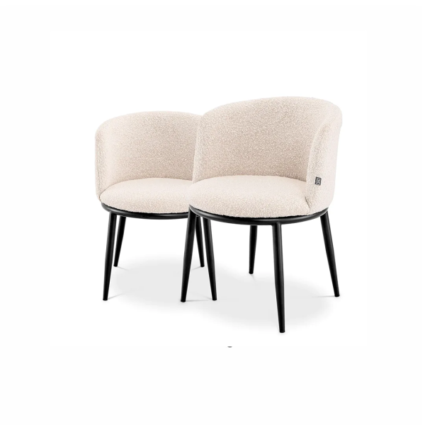 Οι μαύροι σκελετοί με κωνικά πόδια διαθέτουν στρογγυλό κάθισμα και καμπυλωτή πλάτη, επενδυμένα με ύφασμα Bouclé σε γκρι απόχρωση.