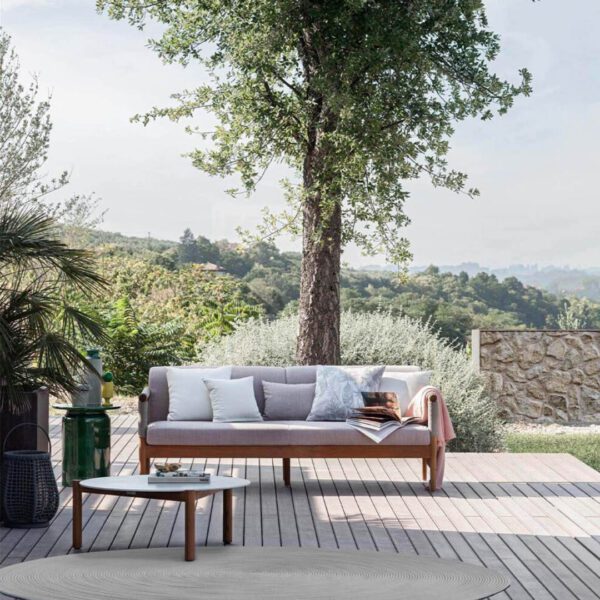 The Lodge tables in solid teak combine design and functionality. The sturdy structure enhances the natural beauty of the wood, while the top, available in stoneware or glazed lava stone, adds an elegant and durable touch, perfect for any setting.