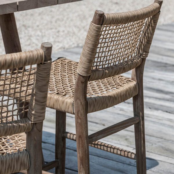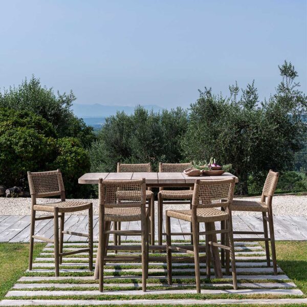 The Bar Chair Mieke by Gommaire is a refined outdoor seating solution that seamlessly blends natural materials with contemporary design. Crafted from natural grey teak wood and sand-colored PE wicker, this bar chair offers both durability and aesthetic appeal. Its ergonomic design ensures comfort, making it an ideal choice for outdoor bars, terraces, and hospitality settings.