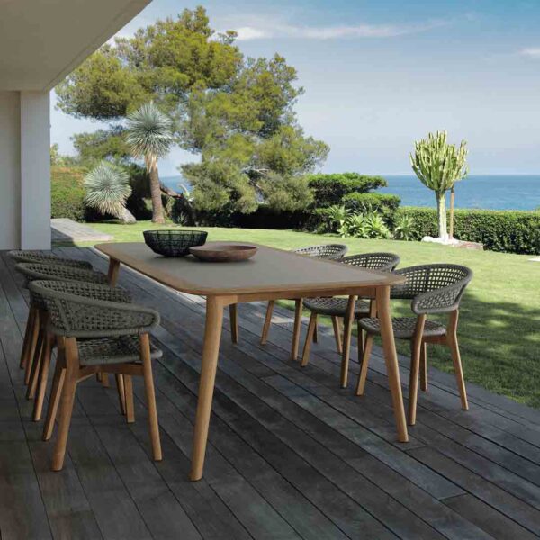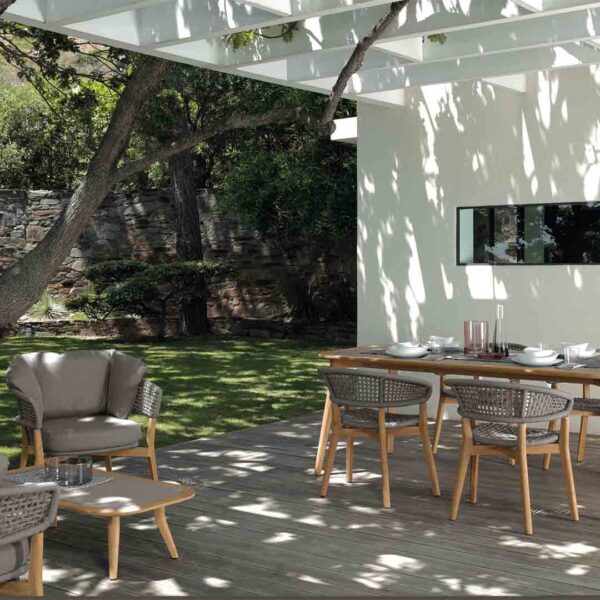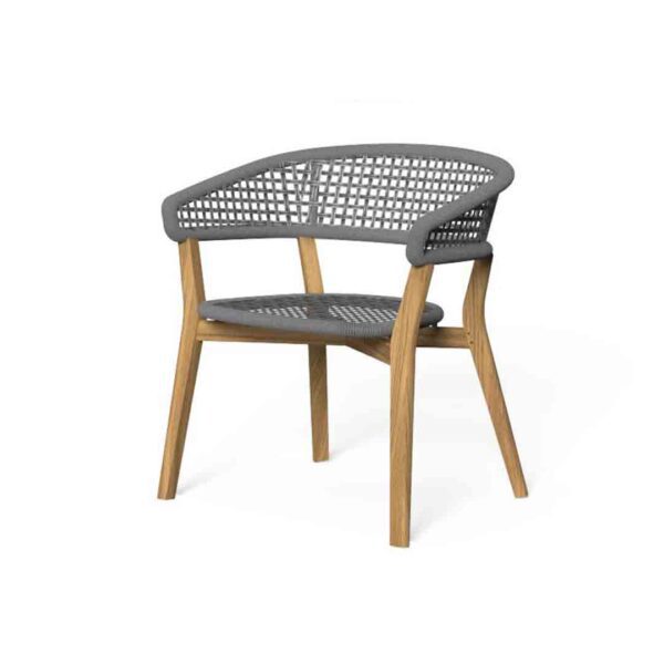 The Moon Teak Dining Chair perfectly blends natural elegance with durable outdoor performance. Crafted from fine-grade teak wood, its rounded lines and curved backrest create a welcoming and stylish silhouette. The hand-woven rope detail on the back adds texture and character, while the padded cushion ensures optimal comfort for long dining experiences.