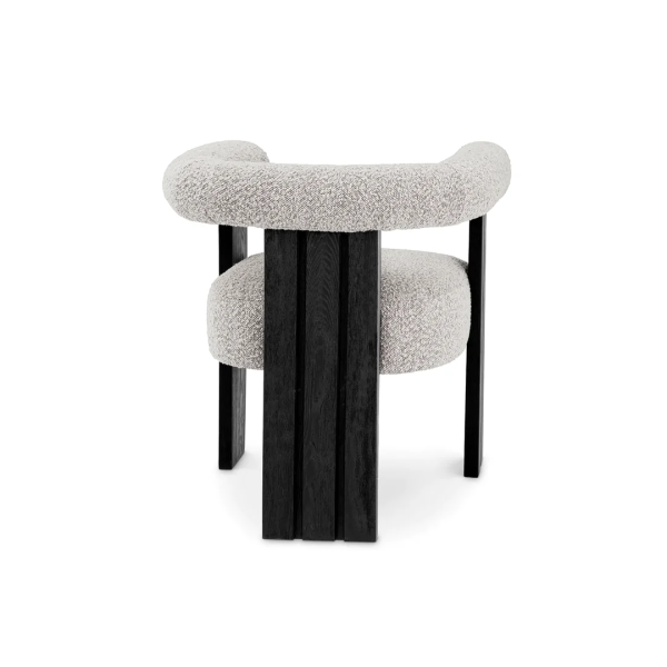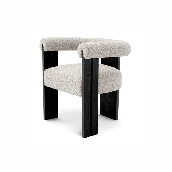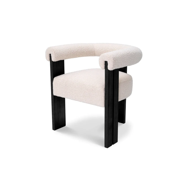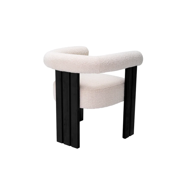 Αυτή η εντυπωσιακή καρέκλα διαθέτει σκελετό με κομψό μαύρο φινίρισμα και στρογγυλή πλάτη που ενσωματώνεται αρμονικά στα μπράτσα. Με επένδυση από ύφασμα Bouclé σε κρεμ απόχρωση, προσφέρει άνεση στους καλεσμένους σας ακόμη και για πολύωρη χρήση.
