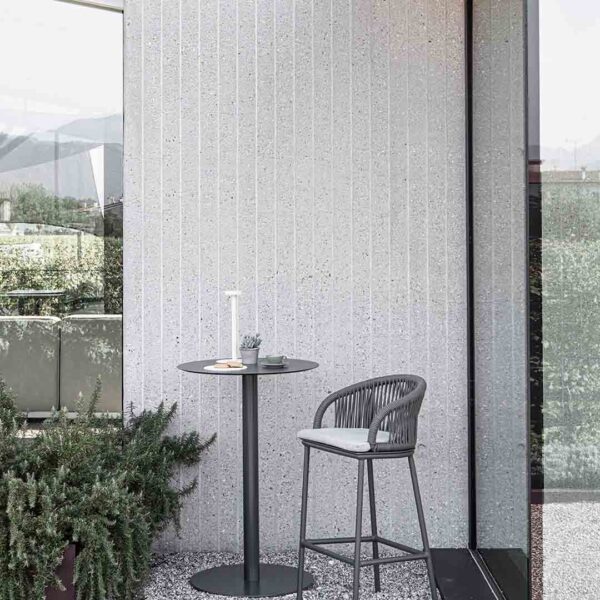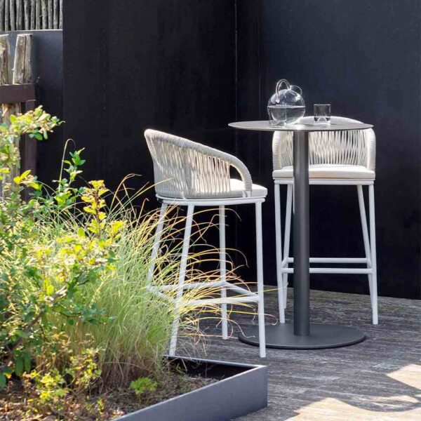 The Pleasure 2.0 Bar Stool by Atmosphera seamlessly blends contemporary design with durable materials, making it an ideal choice for outdoor hospitality settings. Its elegant aluminum frame, available in white or graphite, is adorned with a woven rope resembling textile fibers, offering both aesthetic appeal and comfort.