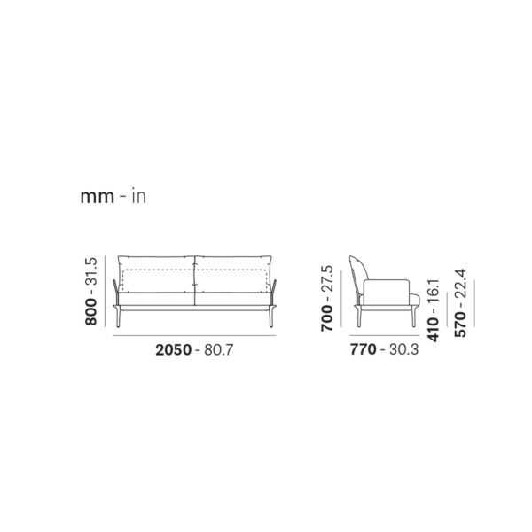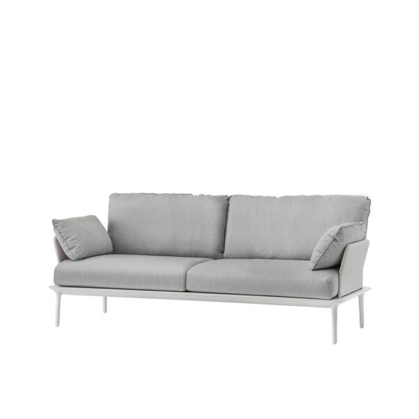 Reva Twist is an outdoor collection with smooth lines and generous sizes. Three-seater sofa with four tapered legs in die-cast aluminium placed at the extremities of the perimeter frame in extruded aluminium. The steel backrest and armrests are woven with a flat rope in weather-resistant polypropylene. Polyester cushions upholstered in fabric.