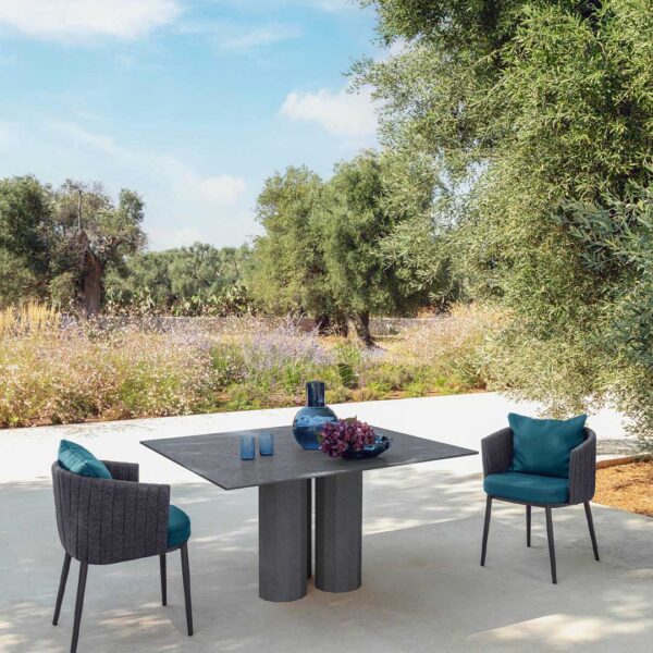 The Salinas dining table conveys the refinement typical of the indoor world into the outdoors. The distinctive design of the columns that support it highlights the texture of the concrete, evoking the natural charm of Salinas, the Ibiza region that inspired the entire collection.