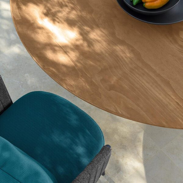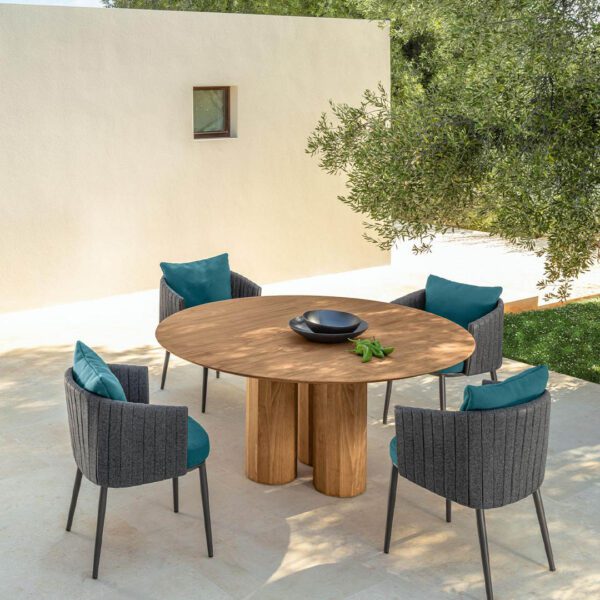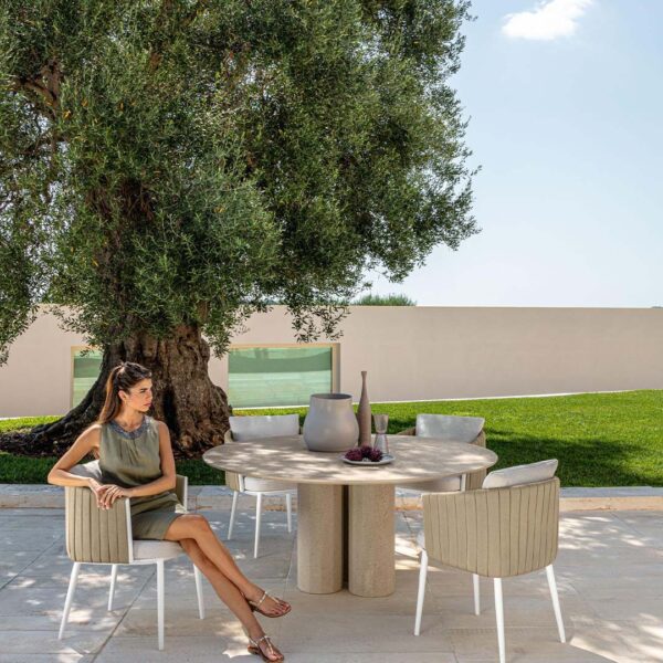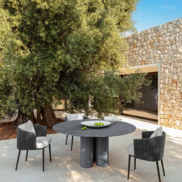 The Salinas dining table has a refined design that exploits the raw material and highlights the texture of the wood. It gives the external environment in which it is inserted charm and elegance, recalling the atmosphere of Salinas, naturalistic region of Ibiza, from which it takes inspiration. The three central columns that support the table recall the classic world.