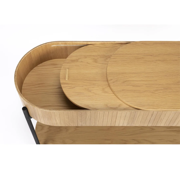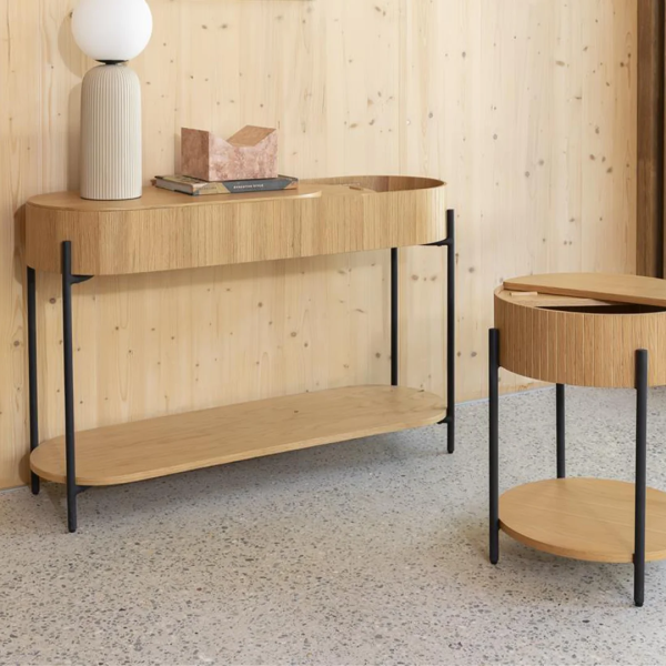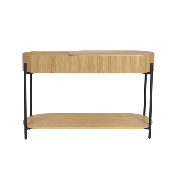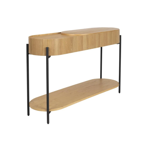 Αναβαθμίστε τον χώρο σας με την κομψή και ευέλικτη κονσόλα Slides. Η έξυπνη συρόμενη επιφάνειά της αποκαλύπτει έναν ευρύχωρο κρυφό αποθηκευτικό χώρο, διατηρώντας παράλληλα την καθαρή, minimal αισθητική της. Με προσεγμένη κατασκευή και προσοχή στη λεπτομέρεια, η κονσόλα Slides συνδυάζει τη ζεστασιά του καπλαμά δρυός με τη μοντέρνα γραμμή των μεταλλικών ποδιών με μαύρη ηλεκτροστατική βαφή, δημιουργώντας μια ισορροπημένη σύνθεση φυσικής ομορφιάς και σύγχρονου σχεδιασμού. Ιδανική για εισόδους, σαλόνια ή γραφεία.