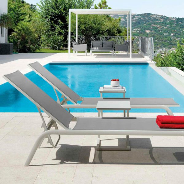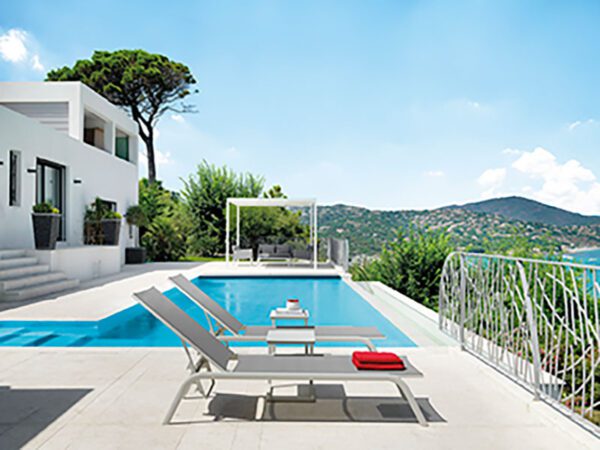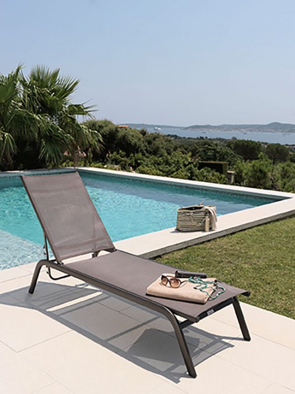 The soft lines of the structure reflect the comfort of the seat. The Step sunbed is lightweight and elegant, featuring the distinctive style of Talenti. Perfect for a refined poolside setting, it combines modern design with functionality. The adjustable backrest ensures maximum outdoor comfort. The frame is made entirely of aluminum, while the seat and backrest are made of durable textilene.