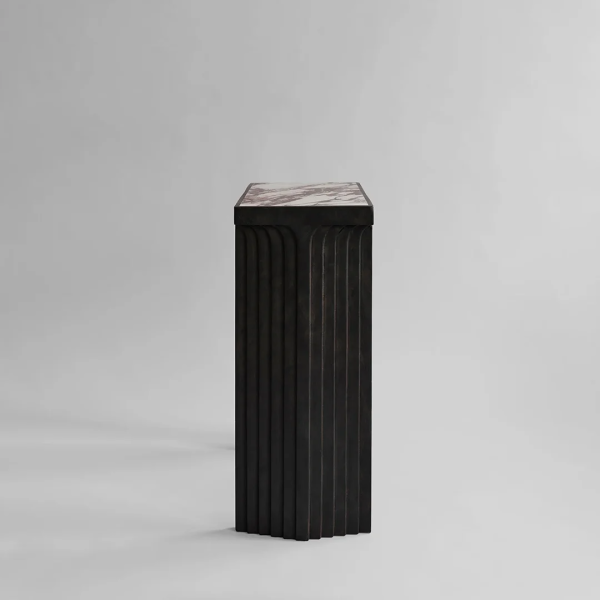 Η κονσόλα Arc διαθέτει βάση από ινοτσιμέντο και επιφάνεια από εκλεκτό μάρμαρο, αναδεικνύοντας τα πλούσια και μοναδικά νερά της φυσικής πέτρας. Η γυαλισμένη επιφάνεια αντανακλά απαλά το φως, προσδίδοντας ζεστασιά στην κονσόλα.