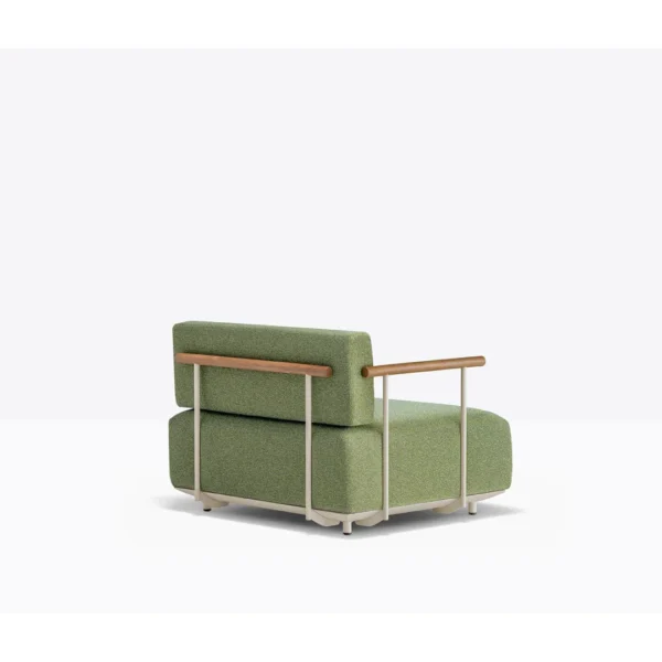 Η πολυθρόνα lounge διαθέτει μπράτσα με επένδυση από αφρό πολυουρεθάνης και αδιάβροχη επένδυση, καλυμμένη με ύφασμα κατάλληλο για εξωτερικούς χώρους. Τα γεωμετρικά διαμορφωμένα και γενναιόδωρα μαξιλάρια στηρίζονται σε ελαφρύ σκελετό με ελαστικούς ιμάντες. Το κάθισμα ανασηκώνεται από το έδαφος με πόδια από ανοξείδωτο ατσάλι, ενώ η πλάτη και τα μπράτσα από σωλήνα ατσαλιού διακοσμούνται με χαρακτηριστικές λεπτομέρειες από ξύλο teak. Η επένδυση είναι αφαιρούμενη για εύκολο καθαρισμό και συντήρηση.