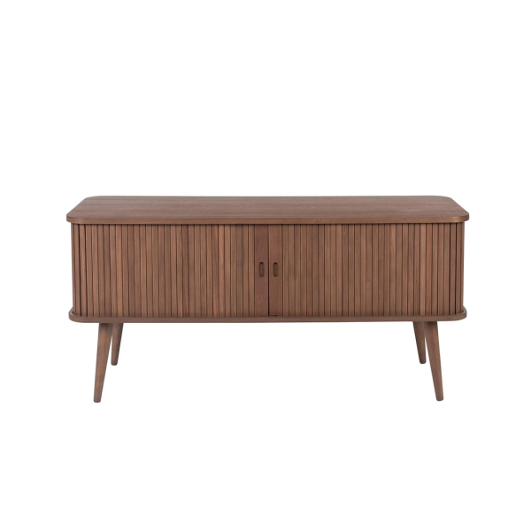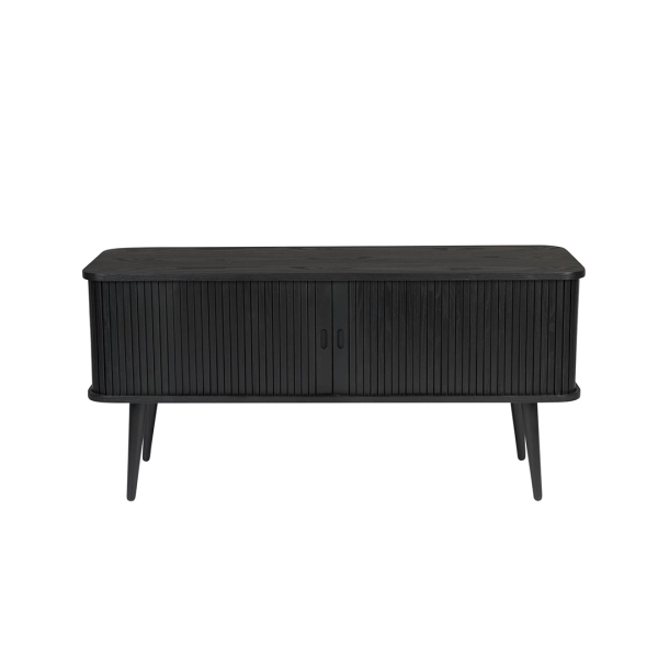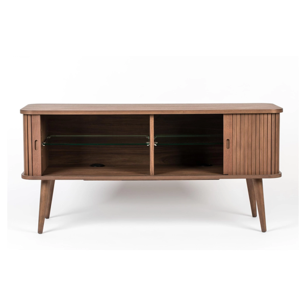 Οι χαρακτηριστικές “θεατρικές” συρόμενες πόρτες τύπου tambour ανοίγουν σαν φτερά σκηνής, δίνοντάς σας τη δυνατότητα να δημιουργήσετε το δικό σας σκηνικό για διακοσμητικά ή συλλογές. Στο εσωτερικό, διαθέτει άφθονο αποθηκευτικό χώρο, δύο γυάλινα ράφια και ειδικές διόδους για καλώδια, καθιστώντας τον ιδανικό για χρήση με συσκευές ή ως media unit.