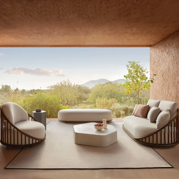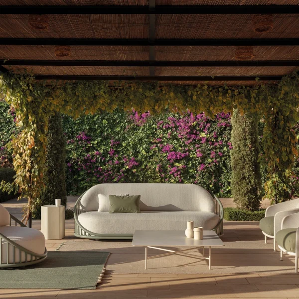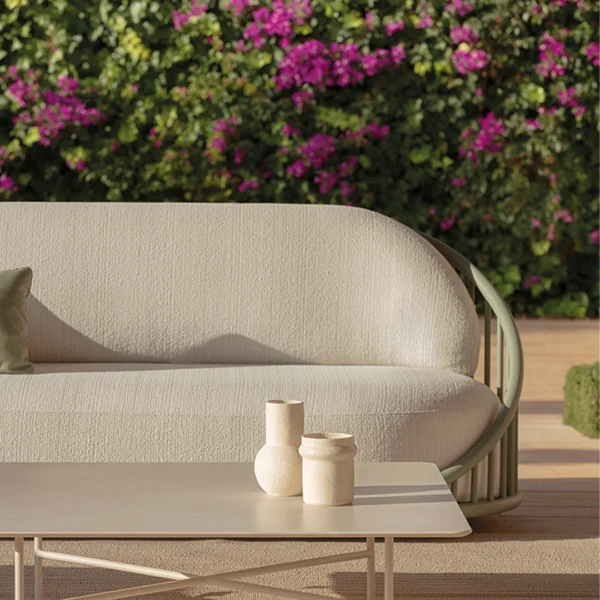 Καναπές κατασκευασμένος από σωλήνα αλουμινίου υψηλής αντοχής. Δυνατότητα εξατομίκευσης με μεγάλη ποικιλία τεχνικών υφασμάτων, πλήρως κατάλληλων για εξωτερική χρήση.