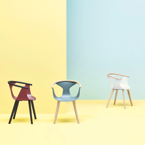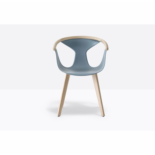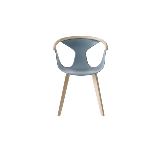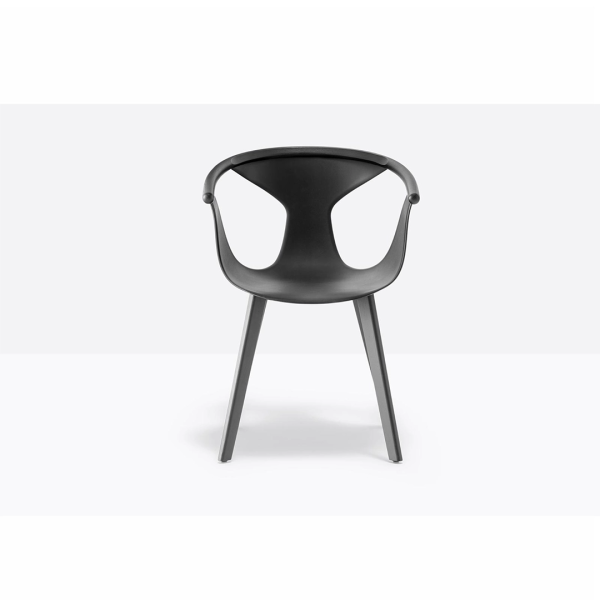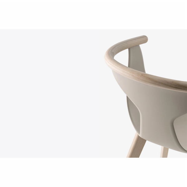 Ξεχωρίζει για τον έξυπνο συνδυασμό υλικών και τις αντιθέσεις μεταξύ οργανικών και γεωμετρικών γραμμών. Το κέλυφος είναι από ανθεκτικό πολυπροπυλένιο, ενώ η καμπυλωτή πλάτη από μασίφ Ξύλο φράξου (ash) προσδίδει φυσική αίσθηση και κομψότητα. Τα μεταλλικά πόδια Ø14mm χαρίζουν ελαφρότητα και σταθερότητα στη συνολική κατασκευή.