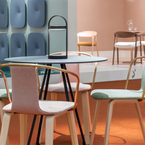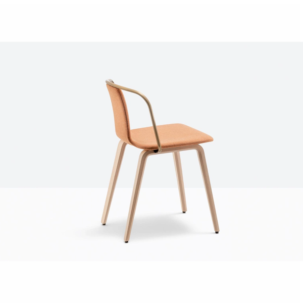Η καμπυλωτή πλάτη με οσφυϊκή στήριξη και τα πόδια από καπλαμά φράξου με μεταβαλλόμενο πάχος, προσφέρουν άνεση και φυσική κομψότητα. Η μεταλλική πλάτη Ø16 mm από σωληνωτό ατσάλι αγκαλιάζει διακριτικά το κάθισμα, προσδίδοντας χρωματική αντίθεση και μοντέρνο χαρακτήρα.