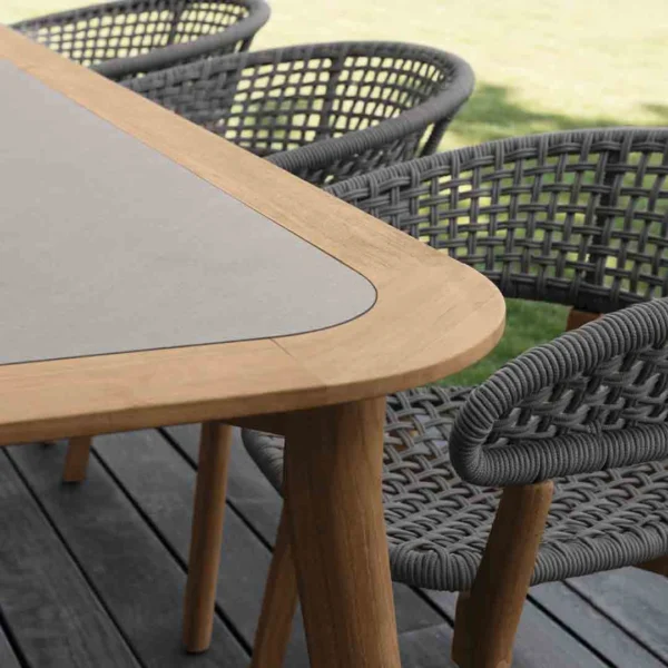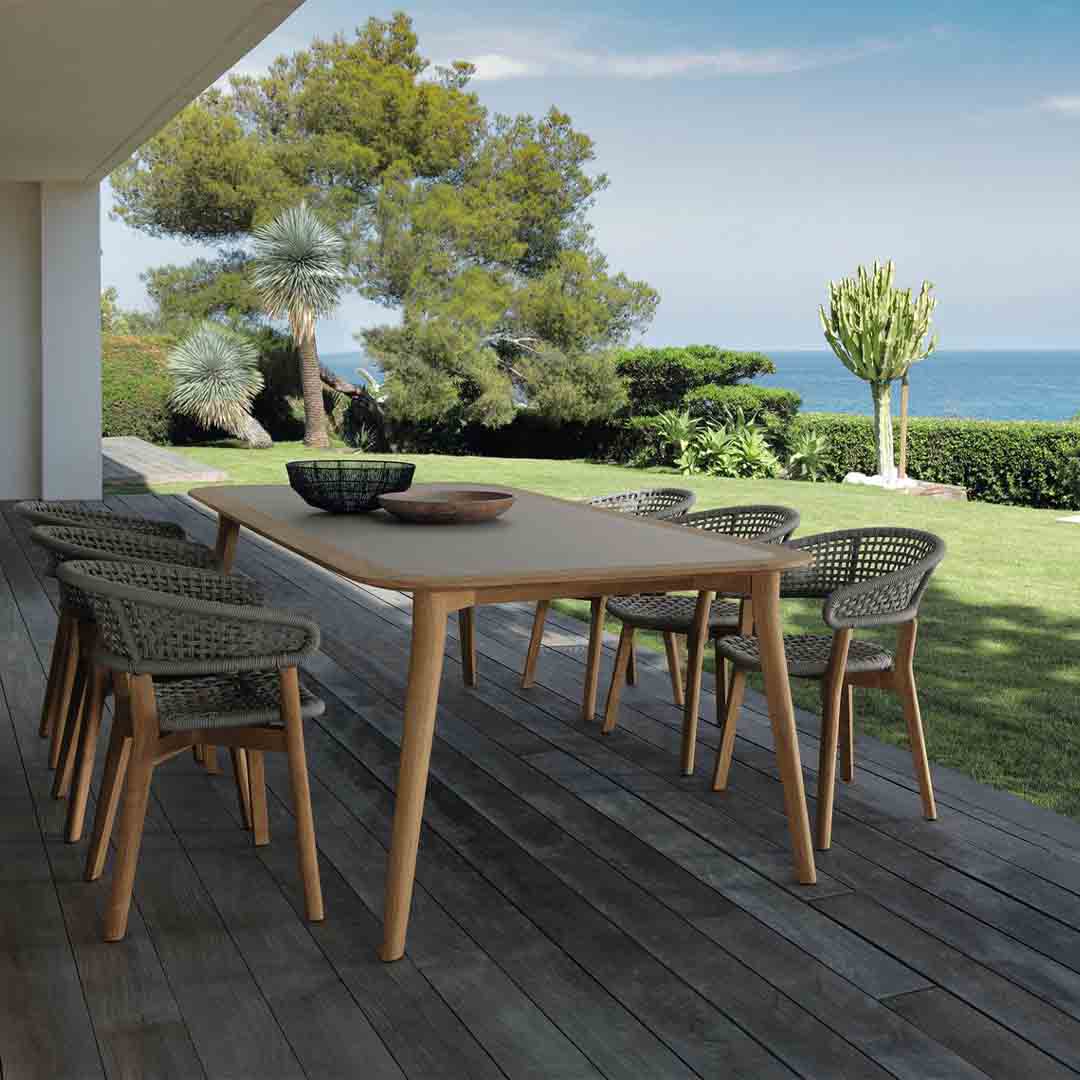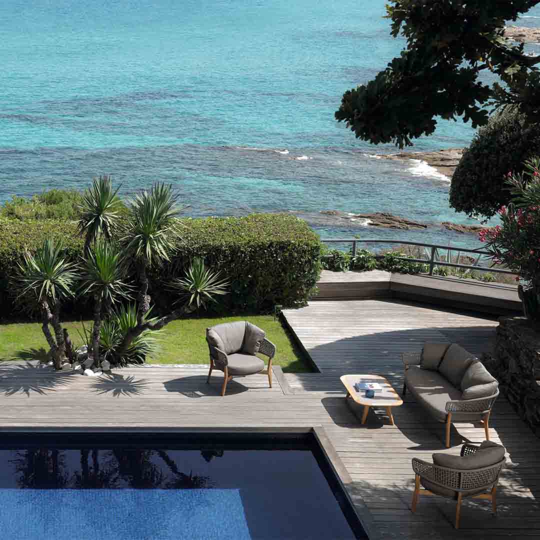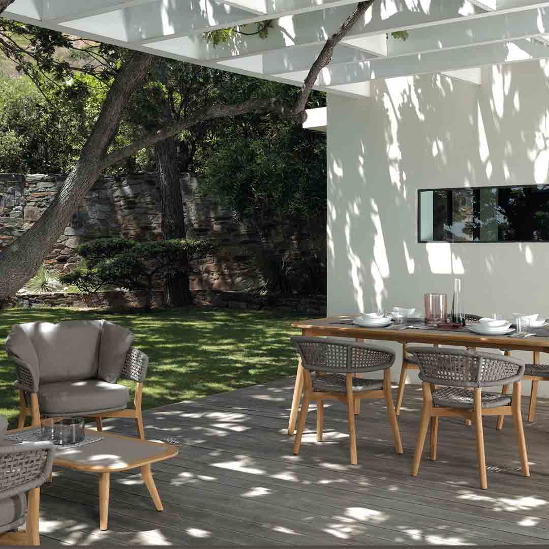 Η Moon Teak συνδυάζει τη φυσική κομψότητα του ξύλου με την τεχνογνωσία των outdoor επίπλων της Talenti. Με σκελετό από υψηλής ποιότητας μασίφ ξύλο teak και κυκλικές, απαλές γραμμές, προσδίδει ζεστασιά και στιλ σε κάθε εξωτερικό χώρο. Η χειροποίητη πλέξη σχοινιού στην πλάτη προσφέρει ιδιαίτερη αισθητική, ενώ το μαξιλάρι καθίσματος εξασφαλίζει άνεση ακόμα και σε πολύωρη χρήση.