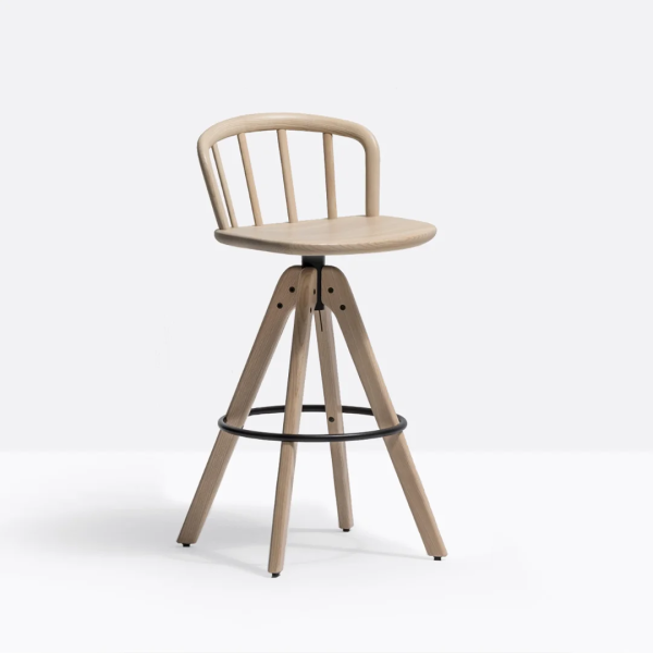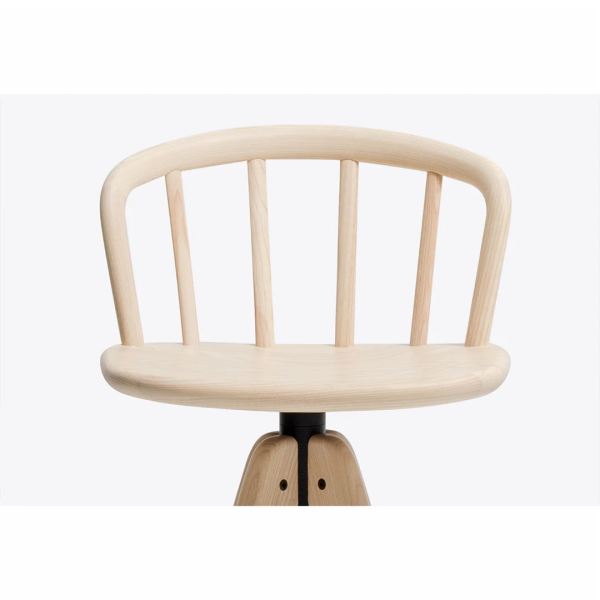 Το σκαμπό μπαρ Nym υιοθετεί την αρχέτυπη δομή της αγγλικής καρέκλας Windsor, την οποία επαναπροσδιορίζει και απλοποιεί, αντανακλώντας σύγχρονα βιομηχανικά πρότυπα παραγωγής. Η καμπυλωτή πλάτη από λυγισμένο Ξύλο ελλειπτικής διατομής ενώνεται αρμονικά με το διαμορφωμένο κάθισμα από μασίφ Ξύλο, σχηματίζοντας ταυτόχρονα μπράτσο. Βάση τύπου καβαλέτου από μασίφ Ξύλο φράξου, με περιστρεφόμενο μηχανισμό και κυκλικό υποπόδιο από ατσάλι.