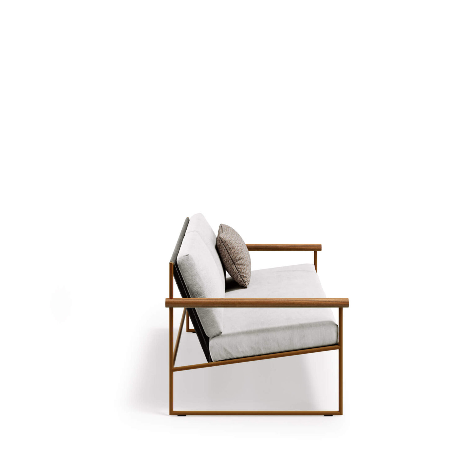 Η συλλογή καθισμάτων Pipe συνδυάζει γραμμικό σχεδιασμό και έντονες γεωμετρίες, δημιουργώντας μια μοναδική οπτική αρμονία. Περιλαμβάνει τριθέσιο καναπέ, διθέσιο καναπέ και πολυθρόνα, με σκελετό από ατσάλι με εποξική επίστρωση σε απόχρωση τερακότα. Η πλάτη, πλεγμένη στο χέρι με ακρυλικά κορδόνια, προσθέτει μια εκλεπτυσμένη πινελιά, ενώ τα κυλινδρικά μπράτσα από ξύλο teak ολοκληρώνουν την αισθητική με μια φυσική κομψότητα.