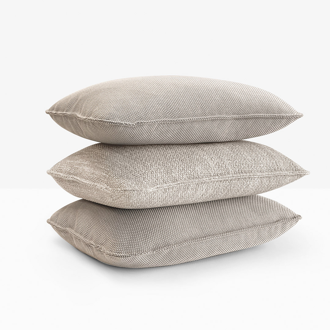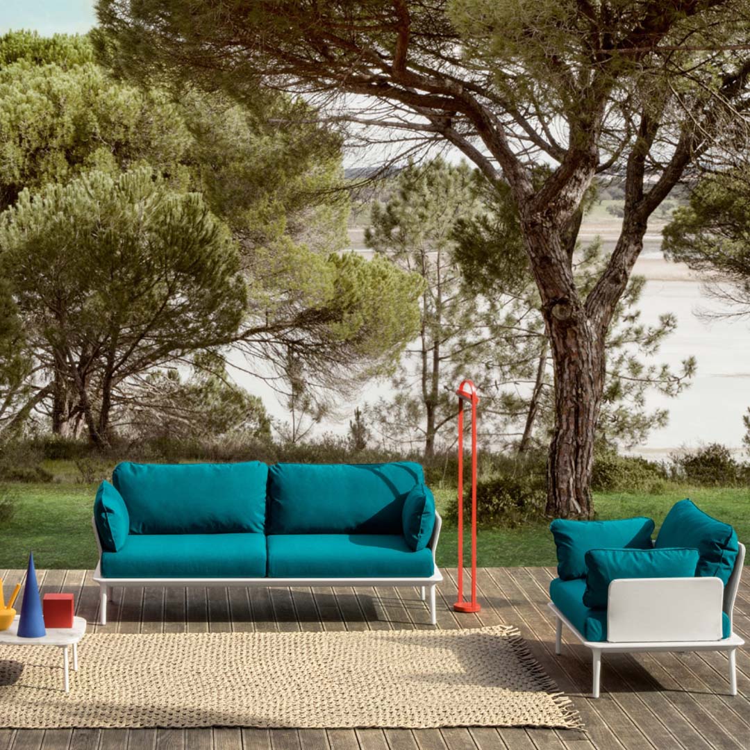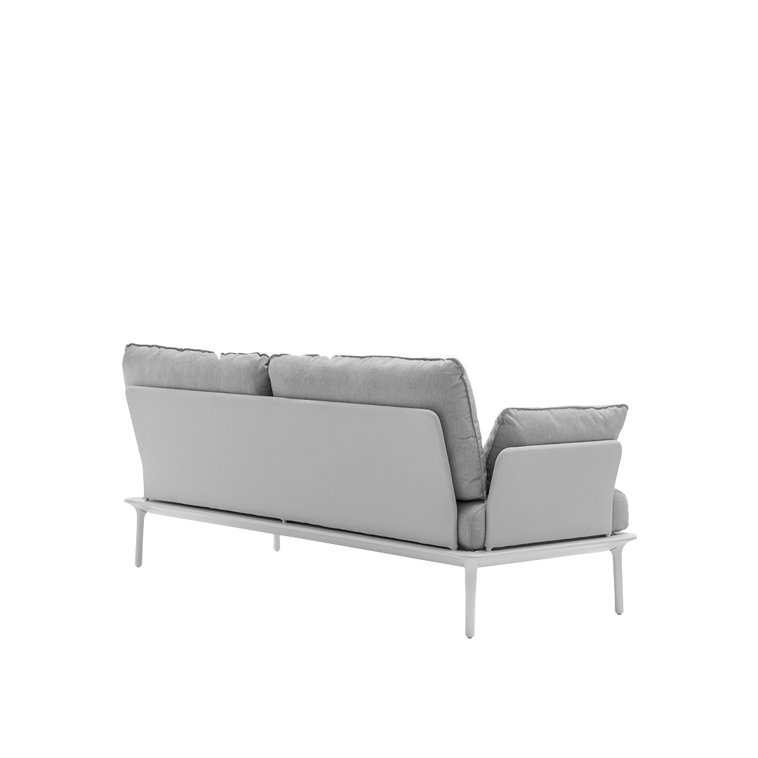 Μια συλλογή εξωτερικού χώρου με απαλές γραμμές και γενναιόδωρες διαστάσεις. Ο τριθέσιος καναπές διαθέτει τέσσερα λεπτά πόδια από χυτό αλουμίνιο, τοποθετημένα στα άκρα του περιμετρικού σκελετού από εξωθημένο αλουμίνιο. Η πλάτη και τα μπράτσα από ατσάλι είναι υφασμένα με επίπεδο σχοινί από ανθεκτικό πολυπροπυλένιο κατάλληλο για εξωτερικούς χώρους. Τα μαξιλάρια είναι επενδυμένα με ανθεκτικό ύφασμα πολυεστέρα.