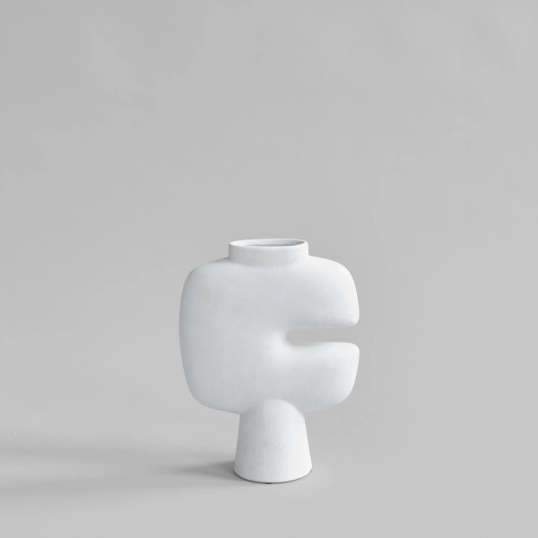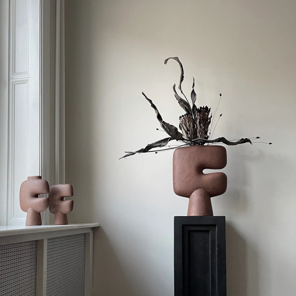Σαν ανοιχτά στόματα πάνω σε βάθρα, τα βάζα της σειράς θυμίζουν μάσκες με εκφραστικές φόρμες και έρχονται σε γήινες, απαλές αποχρώσεις της τερακότα και του γκρι. Καθώς είναι χειροποίητα υαλωμένα φυσικά προϊόντα, ενδέχεται να υπάρχουν μικρές χρωματικές αποκλίσεις. Δεν είναι πλήρως αδιάβροχα — περιλαμβάνεται σακουλάκι για φρέσκα λουλούδια.